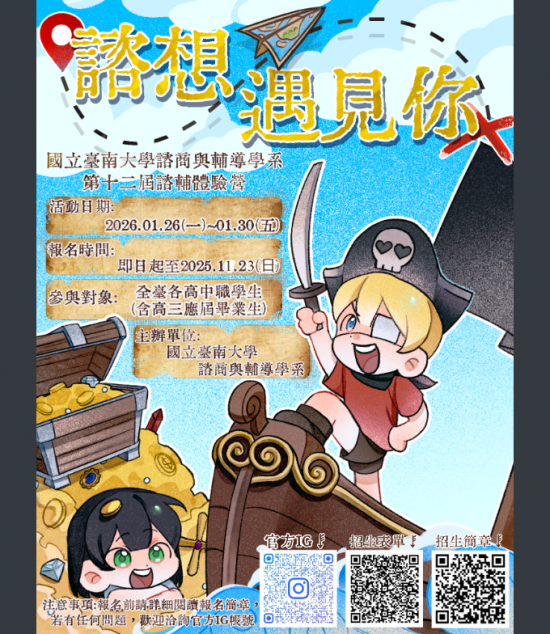 一、活動名稱:臺南大學第十二屆諮輔體驗營-諮想遇見你。