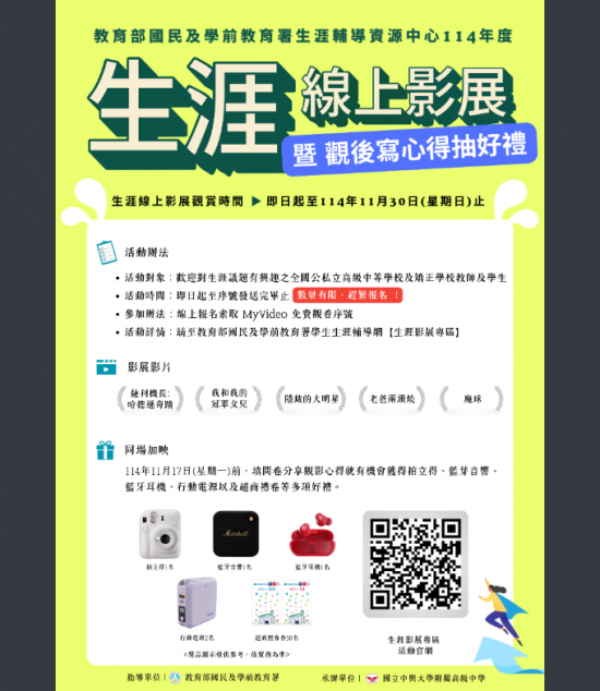 4、參加辦法:(1)請於報名開放期間,前往本署學生生涯輔導網(https://friendlycampus.k12ea.gov.tw/Career)【生涯影展】專區領取觀影序號,每人最多可申請2組不同電影之序號。(2)報名時,請填寫學校提供之電子郵件信箱或教育雲端帳號Email(必須以.edu.tw或moj.gov.tw為結尾),若使用其他電子郵件信箱報名,將不予受理。(3)取得序號者倘欲參與「填問卷分享心得抽好禮活動」,欲參與者請於114年11月17日(星期一)23時59分時限內觀賞,並上網完成回饋問卷。若無參與前項活動,序號最遲可使用至114年11月30日(星期日)23時59分。