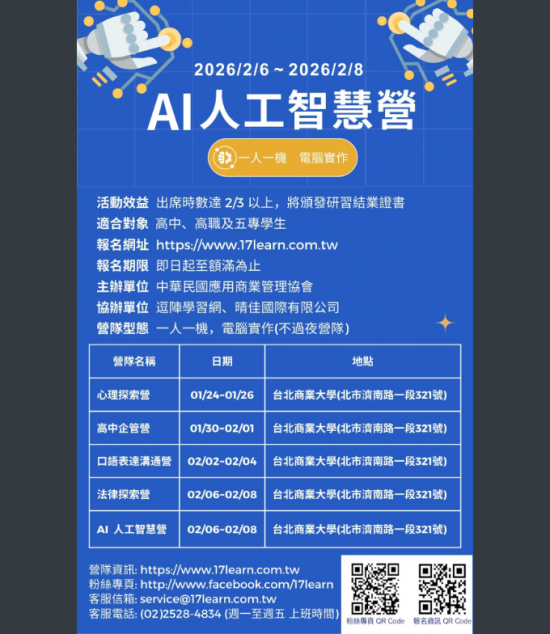 另有【心理探索營】、【法律探索營】、【口語表達溝通營】、【高中企管營】等營隊,歡迎報名參加。