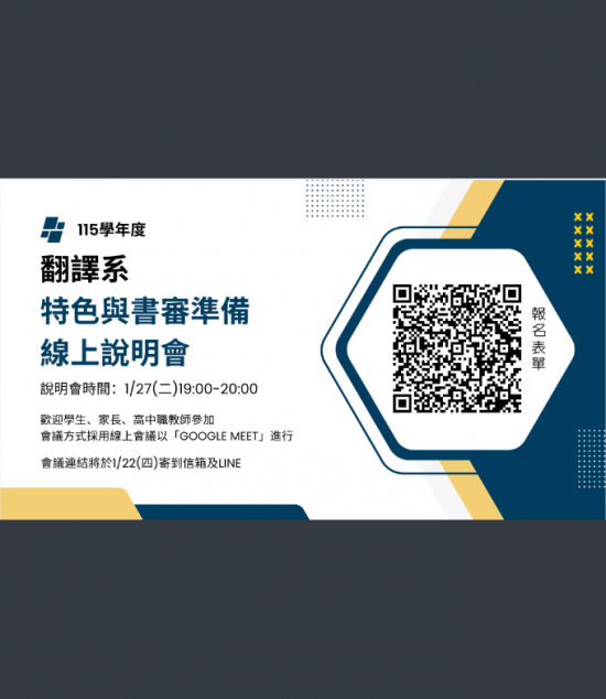 一、為促進學生、教師、家長了解本系學習規劃、未來發展、書審準備方向,辦理線上說明會,歡迎學生、教師、家長參加,會議方式採用線上會議以「Google Meet」進行。說明會報名連結:https://forms.gle/oH6mhAEUdKGoJ6E8A,報名後將於會議前寄送會議連結。